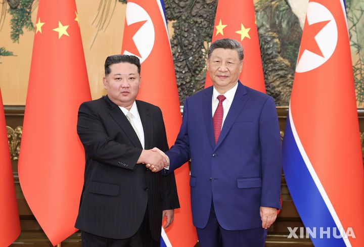 [베이징=신화/뉴시스]김정은(왼쪽) 북한 국무위원장과 시진핑(習近平) 중국 국가주석이 4일 중국 베이징 인민대회당에서 회담하며 악수하고 있다. 북한 정부가 외국 영화와 TV 드라마를 보고 공유하다 적발된 사람들을 포함해 점점 더 많은 사형을 집행하고 있는 것으로 유엔의 한 주요 보고서에 나타났다고 BBC가 12일 보도했다. 2025.09.12. |