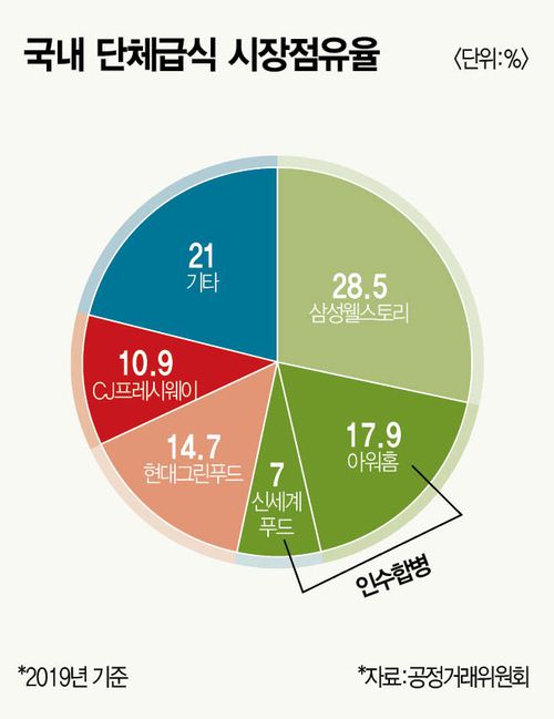 국내 단체급식 시장은 ‘빅5’ 구도가 공고했다. 2019년 기준 시장점유율은 삼성웰스토리(28.5%), 아워홈(17.9%), 현대그린푸드(14.7%), CJ프레시웨이(10.9%), 신세계푸드(7%) 순이다. 상위 5개사가 전체 80%를 차지할 만큼 과점 성격이 강했다. 2019년 이후 공식 점유율 발표는 없었다. 다만 업계는 순위에 큰 변동이 없다고 알려졌다. 급식 사업 선정이 경쟁 입찰로 이뤄지긴 하지만 대부분은 기존 업체와 계약을 유지했기 때문이다.