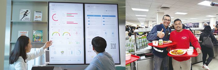 사진 왼쪽은 삼성웰스토리가 운영 중인 헬스케어 건강 코칭 솔루션. 구내식당 고객 식사 기록과 인바디·건강검진 데이터를 기반으로 일대일 맞춤 코칭을 해주는 프로그램이다. 오른쪽은 아워홈이 멕시코에서 진행한 K-푸드데이 단체급식 행사. (각 사 제공) |