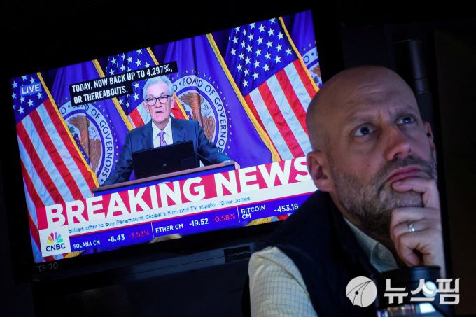 뉴욕증권거래소(NYSE)에서 트레이더가 거래 중인 가운데 제롬 파월 미 연방준비제도(Fed) 의장의 기자회견 화면이 보인다.[사진=로이터 뉴스핌] |