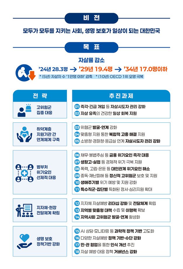 정부가 자살 예방을 위해 국무총리 산하에 자살예방대책본부를 설치하고 지방자치단체마다 부시장·부지사 등 부단체장을 ‘자살예방관’으로 지정하는 등 범정부 차원 총력전에 나선다. 이를 통해 지난해 1만4439명인 자살사망자를 2029년 1만명 아래로 줄이고 10만명당 28.3명으로 경제협력개발기구(OECD) 1위인 자살률을 2034년 17.0명으로 약 40% 낮춘다는 목표다.