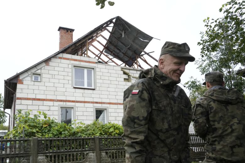 11일(현지시간) 러시아 드론 공격으로 파손된 폴란드 루블린 인근 비르키 마을의 한 주택 앞에 군인이 서 있다. AP연합뉴스