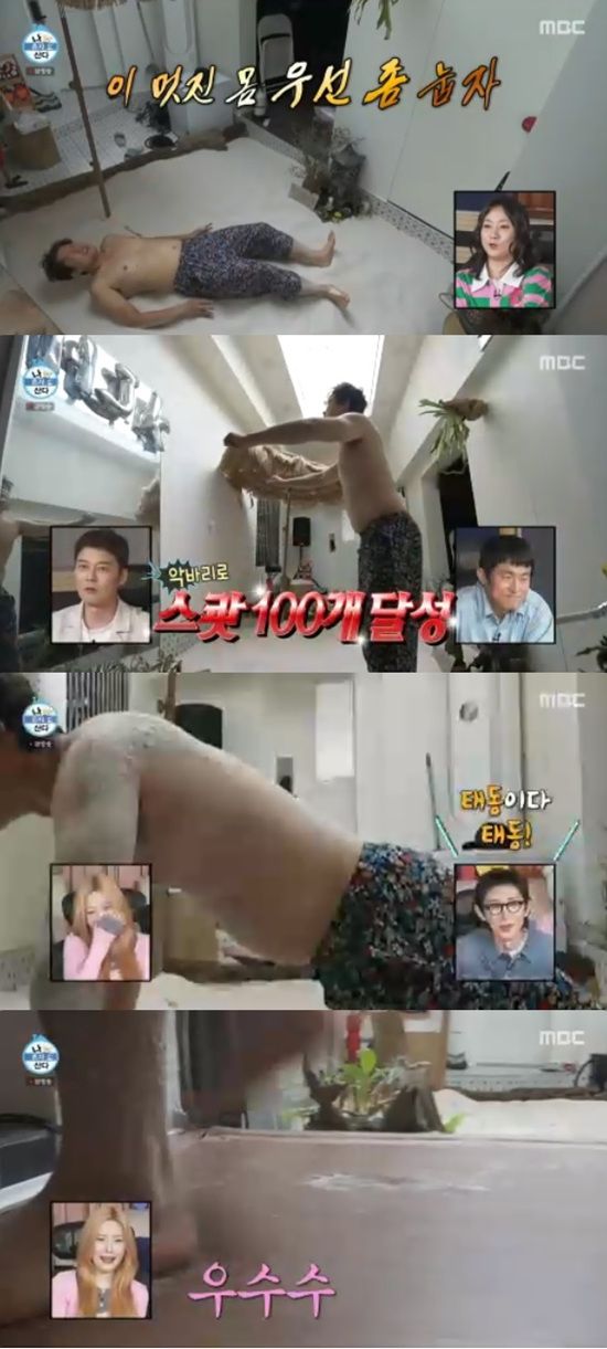 김대호는 스쾃에 이어 팔굽혀펴기를 하려는 자세를 취하더니 뱃살을 꿀렁였다. 스튜디오에서 보던 멤버들은 "태동 같다"면서 웃음을 터트렸다.