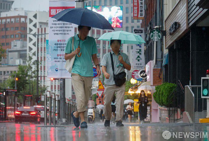 [서울=뉴스핌] 류기찬 인턴기자 = 서울에 호우주의보가 발령된 13일 오전 서울 중구의 한 거리에서 시민들이 이동하고 있다. 2025.08.13 ryuchan0925@newspim.com |