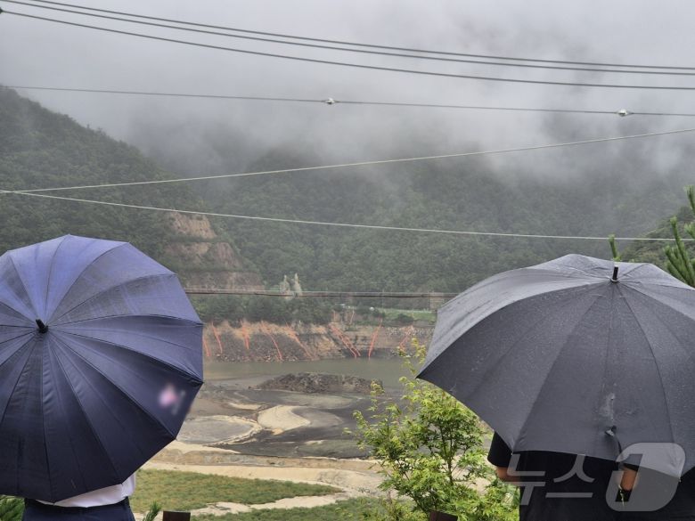 이날 오전 오봉저수지가 내려다보이는 말구리재 전망대엔 우산을 든 시민들이 모여들었다. 바닥이 드러나 갈라졌던 저수지에 빗물이 쏟아지자, 이들은 마치 비경을 보듯 휴대전화로 사진과 영상을 찍었다.