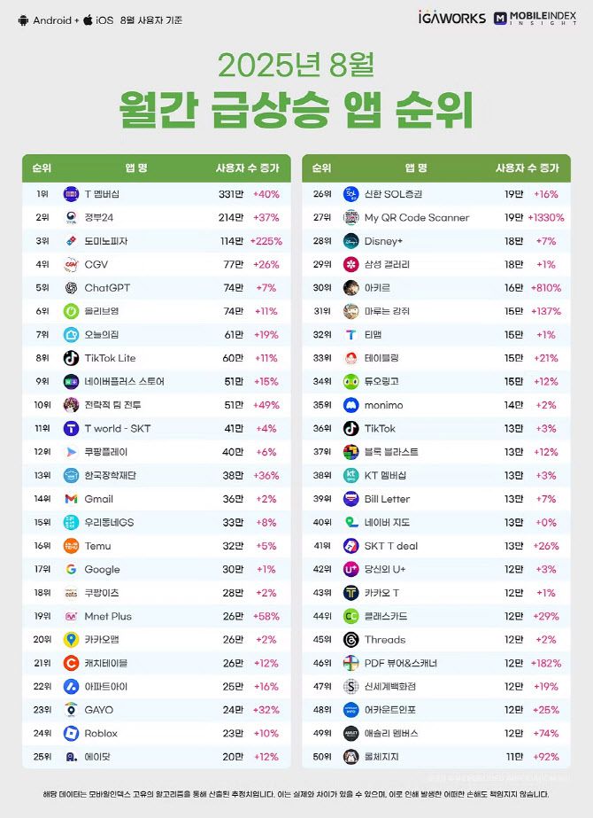 정부24는 주민등록 사실조사와 민생소비쿠폰 안내로 214만 명이 늘었고, 도미노피자는 T멤버십 제휴 할인 효과를 등에 업고 114만 명의 사용자가 새로 유입됐다.