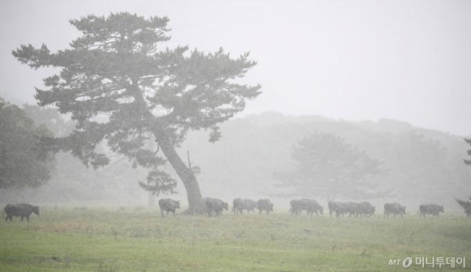지난 7월 제주시 용강동 제주마 방목지에서 국가지정 천연기념물인 제주흑우가 강한 빗줄기를 피해 이동하고 있다. /사진=뉴시스