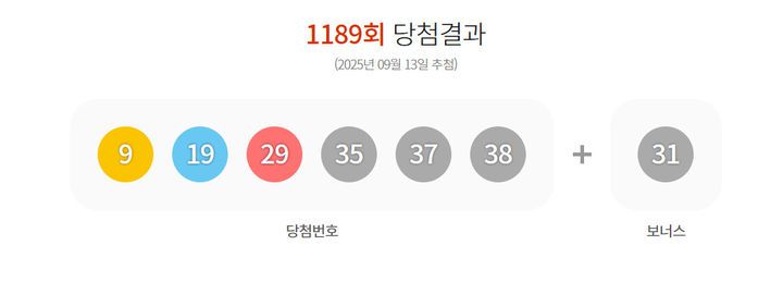 [서울=뉴시스] 13일 제1189회 동행복권 로또 추첨 결과 '9, 19, 29, 35, 37, 38'이 1등 당첨 번호로 결정됐다. 2등 보너스 번호는 '31'이다.(사진=동행복권 홈페이지 캡쳐) 2025.09.13 photo@newsis.com *재판매 및 DB 금지 |