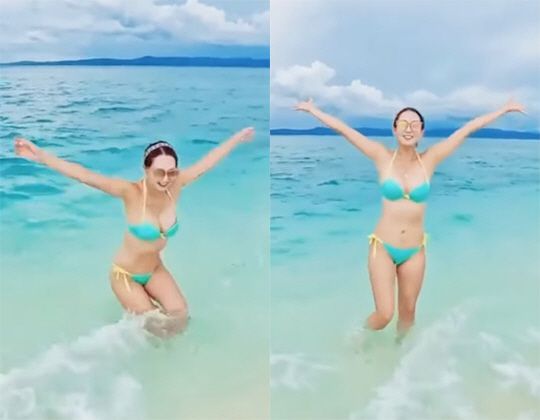 영상에서 오정연은 바닷가에서 날씬한 비키니 자태를 뽐냈다. 민트색 비키니를 입고 상큼한 매력을 뽐낸 그는 두 팔을 머리 위로 활짝 들어 올리는 포즈를 취하며 영화 속 한 장면 같은 분위기를 연출했다. 푸른 바다와 하늘을 배경으로 환하게 웃으며 여유로운 시간을 만끽하는 그의 모습이 눈길을 사로잡는다.