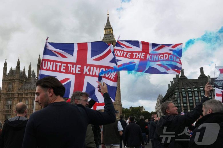 영국 런던 국회의사당 주변의 극우 시위대. 2025.09.13 ⓒ AFP=뉴스1 ⓒ News1 이지예 객원기자 |