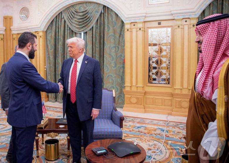 지난 5월 14일(현지시간) 사우디아라비아 리야드에서 열린 회담에서 도널드 트럼프 미국 대통령이 무함마드 빈 살만 사우디 왕세자(오른쪽)가 지켜보는 가운데 아메드 알샤라 시리아 임시대통령과 만나 악수하고 있다. 2025.05.14 ⓒ AFP=뉴스1 ⓒ News1 류정민 특파원 |