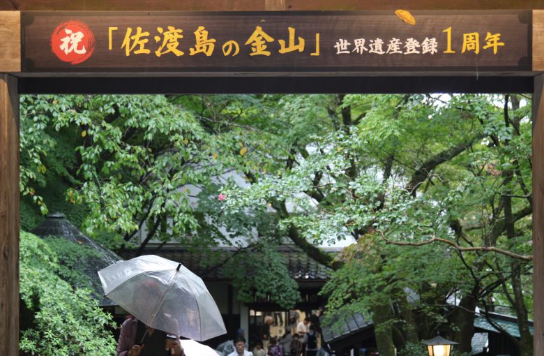 일본 니가타현 사도섬 사도광산에 유네스코 세계유산 등재 1주년을 축하하는 현수막이 걸려 있다. |