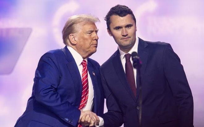 왼쪽은 도널드 트럼프 미국 대통령, 오른쪽은 미국 보수 활동가인 찰리 커크. 현지시간으로 10일 유타주에서 열린 행사 도중 총에 맞아 사망했다.