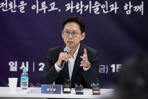 배경훈 과학기술정보통신부 장관이 지난 12일 오후 서울 종로구 HJ비즈니스센터에서 열린 과기부 기자간담회에서 취재진의 질문에 답하고 있다. 과학기술정보통신부 제공 |