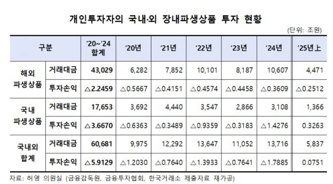 개인투자자들이 ‘단기 고수익’을 기대하고 파생상품 시장에 뛰어들었지만, 최근 5년간 6조원에 가까운 손실을 본 것으로 나타났다. 단 한 해도 이익을 내지 못한 채 매년 손실이 이어졌으며, 해외 상품보다 국내 상품에서 피해가 더 컸다.