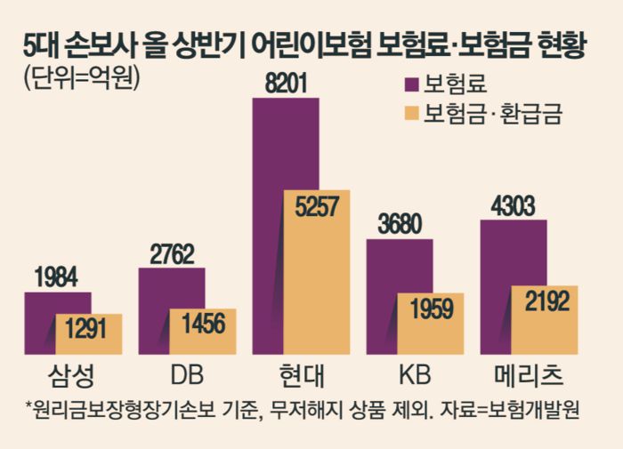 보험금 지급은 계속 늘고 있지만 보험사가 고객에게 받은 돈은 줄었다. 상반기 국내 손보사가 어린이보험에서 수취한 보험료는 2조2918억원으로 전년 동기 2조4809억원과 비교해 5% 가까이 빠졌다. 반면 같은 기간 전체 개인 보험에서 받은 보험료는 35조6848억원으로 지난해 같은 기간과 비교해 7% 이상 불어났다. 개인에게서 수취하는 보험료는 전반적으로 늘고 있지만, 유독 어린이보험에선 줄고 있는 것이다.