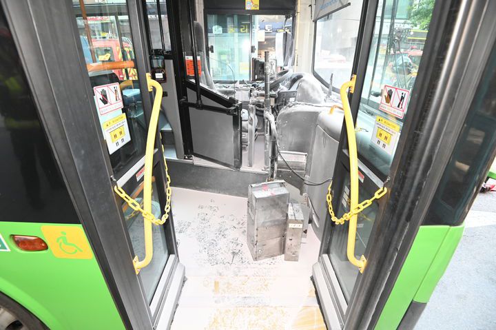 [서울=뉴시스]14일 오후 서울 금천구에서 운행 중인 시내버스에 그을린 흔적이 보이고 있다. 이날 소방 당국에 따르면 이날 오후 3시50분께 서울 금천구 독산로 시흥4동 사거리 앞 버스정류장 앞에서 운행 중이던 지선버스의 운전석에서 불이 났다. 운전기사가 조작부 전원을 차단하고 소화기를 뿌려 화재 발생 35분 만인 오후 4시25분께 불길이 완전히 진압됐다. (사진=서울 금천소방서 제공) 2025.09.14. photo@newsis.com *재판매 및 DB 금지