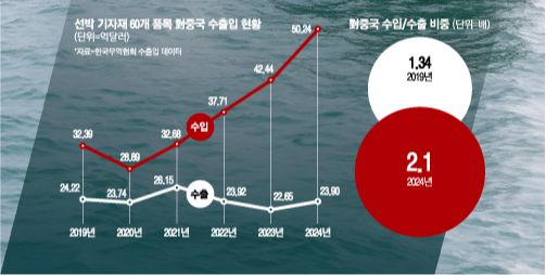 14일 한국무역협회 수출입데이터에 따르면 선박평형수처리설비·펌프·기계·밸브류 등 선박 기자재 60개 품목의 대중 무역 적자는 2019년 8억1700만달러에서 2024년 26억4400만달러로 약 18억달러(2조5000억원) 증가한 것으로 나타났다. 같은 기간 수출 대비 수입 비율은 1.34배에서 2.1배로 악화됐다.