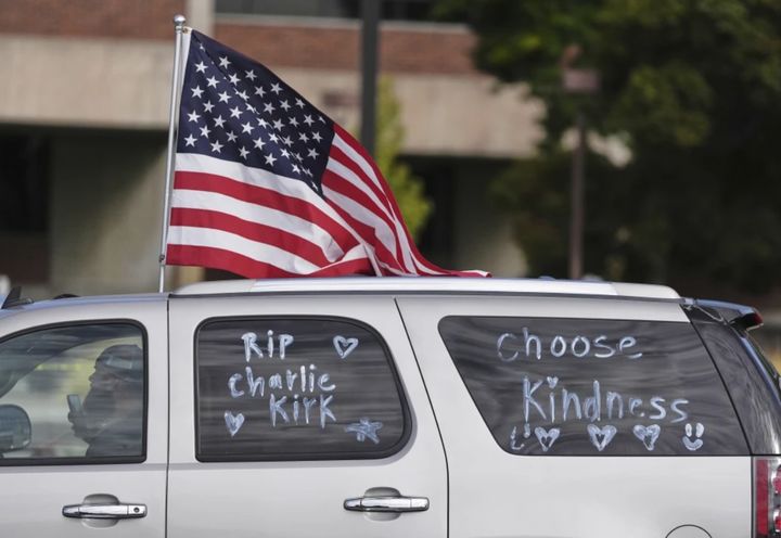[오렘(미 유타주)=AP/뉴시스] 13일 미국 유타주 오렘의 유타밸리대를 지나가는 차량의 창문에‘터닝 포인트 USA’의 최고경영자(CEO)이자 공동 창립자로 10일 총격을 받아 사망한 보수 활동가 찰리 커크를 추모하는 메시지가 적혀 있고, 미국 국기를 달고 있다. 2025.09.15. *재판매 및 DB 금지 |