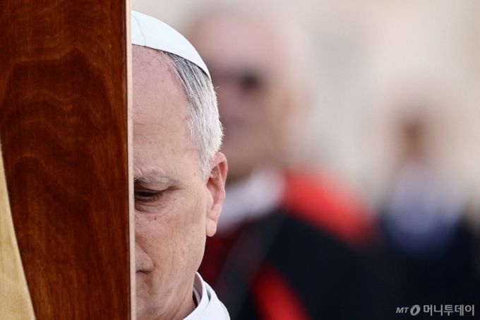 레오 14세 교황이 지난 6월9일 바티칸에서 성좌 희년 미사를 주재하기 위해 행렬에 도착하며 십자가를 들고 있다. /바티칸 로이터=뉴스1 |