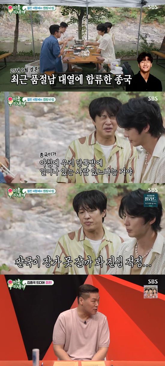 이날 차태현, 김준호, 김종민, 윤시윤은 계곡으로 떠나 여러 이야기를 나눴다. 특히 최근 결혼한 스타들이 많은 것에 대한 이야기가 나오자 차태현은 "종국이가 아침에 우리 단체방에 일어나 있는 사람이 있느냐더라. 일어나 있다니까 영상 통화가 왔다"며 김종국도 언급했다.
