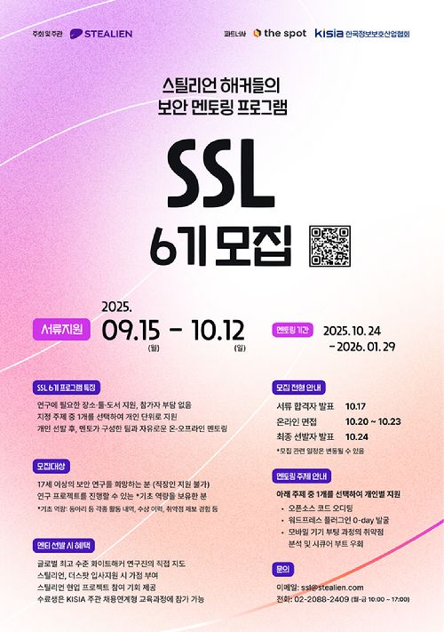 지난 2020년 1기를 시작한 SSL은 그간 총 74명의 수료생을 배출하며 올해 6번째를 맞았다. 6기는 지난 4, 5기에 이어 모바일 취약점 연구기업 '더스팟'과 한국정보보호산업협회(KISIA)가 함께한다.