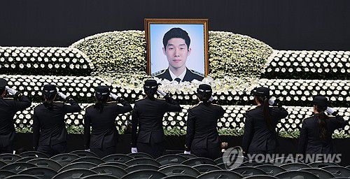 (인천=연합뉴스) 임순석 기자 = 15일 인천 서구 인천해양경찰서에서 엄수된 '해양경찰관 고(故) 이재석 경사 영결식'에서 동료 경찰들이 경례하고 있다. 2025.9.15 [공동취재]