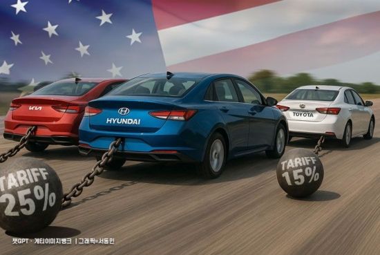 15일 업계에 따르면 한국과 일본의 관세율이 각각 25%와 15%로 벌어지면 주요 수출 차종에서 가격 역전이 예상된다. 현재 미국에서 기아 스포티지 하이브리드는 3만290달러, 도요타 라브4 하이브리드는 3만2850달러에 판매된다. 관세 변동분을 적용하면 스포티지는 3만7863달러로, 라브4 3만7778달러 보다 비싸지게 된다.
