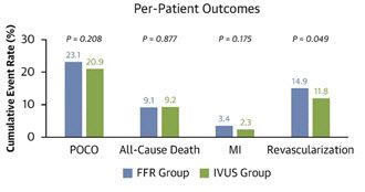 그럼에도 전체 기간 대상혈관의 누적 스텐트 시술은 분획혈류예비력군이 유의미하게 낮았다. 이 기간 혈관내초음파군은 10명 중 6명(60.5%)이 시술을 받은 반면, 분획혈류예비력군은 10명 중 3~4명(38.8%)이 받았다. 즉, 분획혈류예비력 검사는 불필요한 스텐트 시술을 줄이는 효과가 뚜렷했고, 혈관내초음파는 장기적으로 재시술을 예방한다는 서로 다른 장점이 있었다.