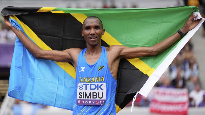 ▲ 탄자니아의 심부가 15일 일본 도쿄에서 열린 2025 세계육상선수권 남자 마라톤에서 우승한 뒤 세리머니를 하고 있다.