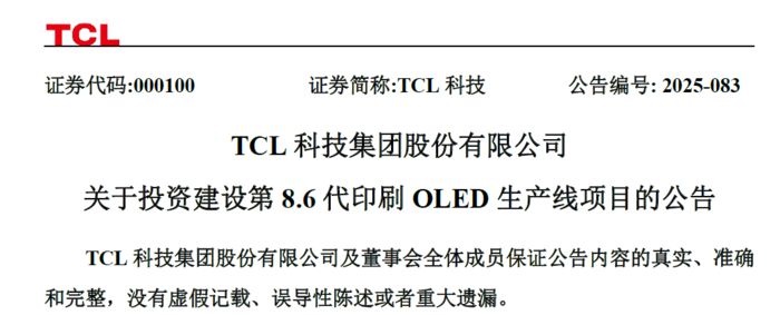 중국 디스플레이 업체 CSOT가 8.6세대 OLED 생산시설 투자를 발표했다. CSOT는 TV 완성품 제조사 TCL의 자회사다. 〈자료 선전증권거래소〉 |