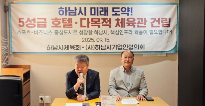 하남시체육회와 기업인협의회가 15일 기자회견을 열고 5성급 호텔과 3000석 규모의 다목적 체육관을 건립해야 한다고 촉구했다.