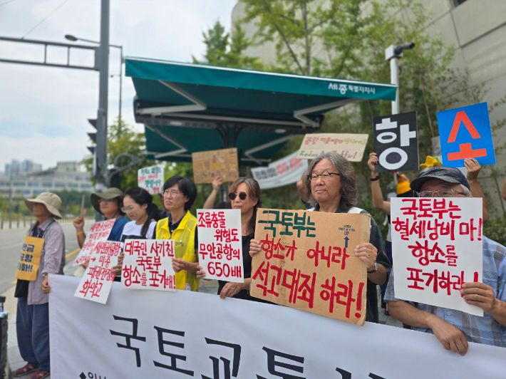 새만금신공항 백지화공동행동은 15일 오전 세종특별자치시 국토교통부 청사 앞에서 기자회견을 열고 "국토교통부는 행정법원의 취소판결을 엄중히 수용해 사죄하고, 새만금신공항 사업을 즉각 취소해야 한다"고 외쳤다.
