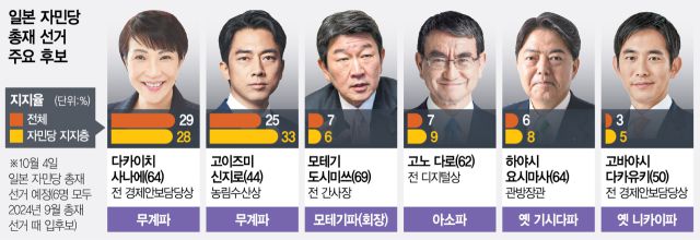 의원내각제인 일본에서는 일반적으로 다수당 대표가 총리가 된다. 자민당은 지난해 10월 중의원 선거와 올해 7월 참의원 선거 모두 과반을 지키지 못했지만 야당 간 지향점이 크게 다른 정치 구도상 다음 달 총리 지명 선거에서 자민당 총재가 총리에 오를 가능성이 높다. 다카이치 전 경제안보담당상과 고이즈미 농림수산상이 각각 최초 여성, 최연소 총리 타이틀을 두고 경쟁하게 되는 셈이다.