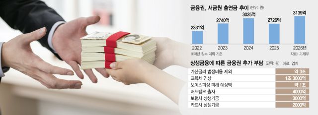 금융사의 서금원 출연금은 금융사의 대출 잔액이 늘면서 매해 증가하는 추세다. 당초 출연 요율은 0.03%였지만 금융 당국이 올해 3월 요율을 0.06%로 끌어올리면서 출연금은 더 늘었다. 실제로 연간 출연액은 2022년 2338억 원에서 내년 3139억 원으로 34.3% 늘어날 예정이다. 금융권 관계자는 “서민금융 상품 재원의 두 축은 정부 예산과 금융권 출연금”이라며 “재정 당국이 그동안 정책금융 사업에 예산을 투입하기를 꺼려해 금융권 출연 부담이 늘어난 측면이 있다”고 말했다.
