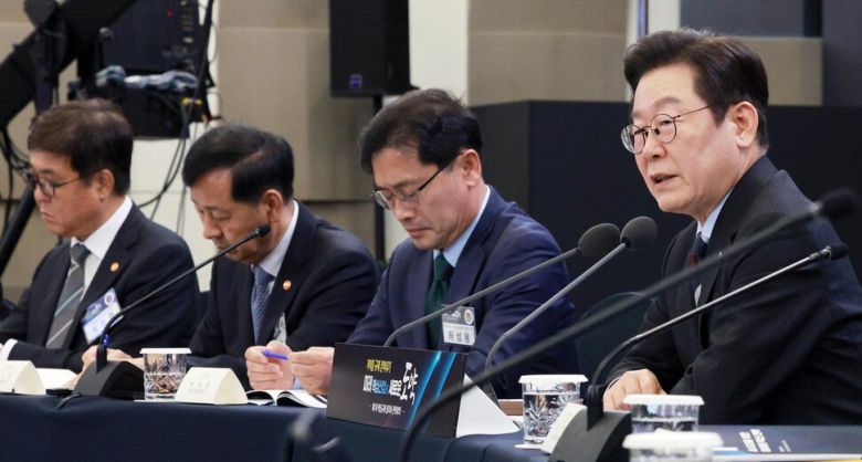 이재명 대통령이 15일 서울 성북구 한국과학기술연구원(KIST)에서 열린 핵심규제 합리화 전략회의에서 발언하고 있다. 왼쪽 두번째에 구윤철 부총리 겸 기획재정부 장관이 보인다. 연합뉴스 |