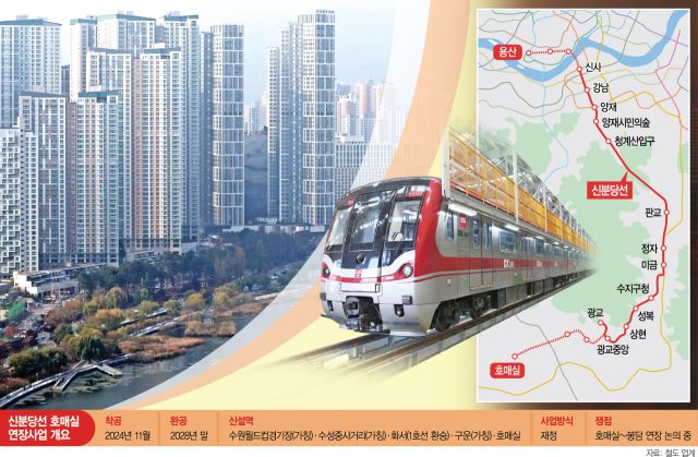 15일 철도공단에 따르면 신분당선 호매실 연장의 공정률은 6월 기준 12.1%다. 총 사업비 1조 1049억 원을 투입해 2028년 말까지 완공한다는 목표로 지난해 11월 공사에 들어갔다. 광교중앙역과 호매실역 사이 수원월드컵경기장역(가칭), 수성중사거리역(가칭), 화서역(1호선 환승), 구운역(가칭), 호매실역(가칭)이 들어설 예정이다. 사업이 완료되면 약 5000억 원의 분담금을 부담하고 입주한 호매실 택지지구 주민들의 지하철 접근성이 크게 개선될 것으로 기대된다.