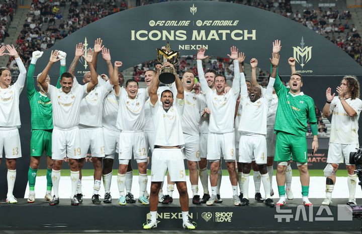 [서울=뉴시스] 홍효식 기자 = 14일 오후 서울 마포구 서울월드컵경기장에서 열린 넥슨 2025 아이콘 매치 FC 스피어(공격수팀)와 쉴드 유나이티드(수비수팀)의 경기, 2-1로 승리한 쉴드 유나이티드 선수들이 트로피를 들고 기뻐하고 있다. 2025.09.14. yesphoto@newsis.com