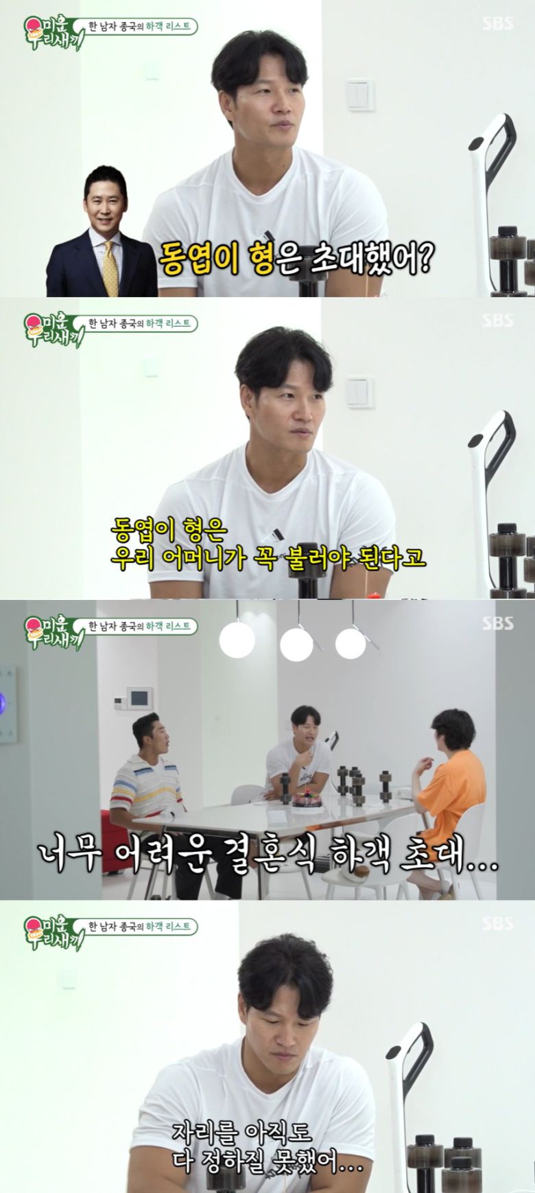 이에 김희철은 신동엽 초대 여부를 물었고, 김종국은 "동엽이 형은 우리 어머니가 꼭 불러야 한다더라"며 초대 이유를 밝혔다.