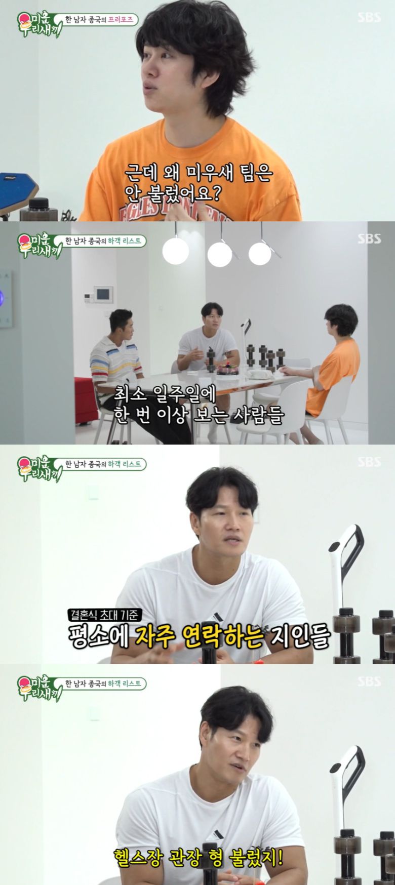 이에 김희철은 "그럼 헬스장 사람들은 다 불렀나"라며 궁금증을 표했고, 김종국은 "헬스장 관장 형은 불렀다. 그 정도면 매일 보는데 불러야지"라고 답해 웃음을 안겼다.