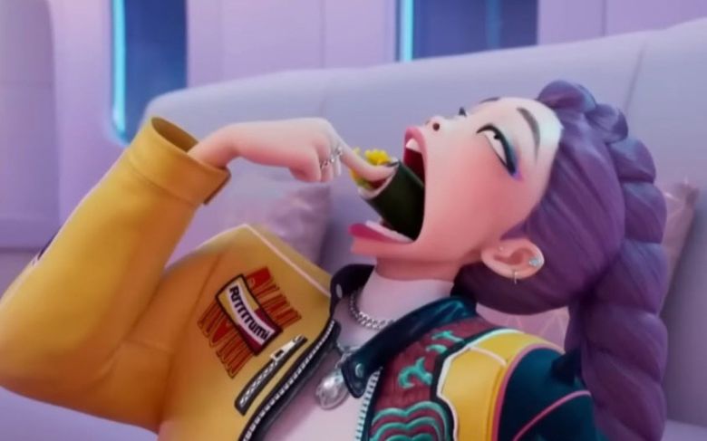 <케데헌>에는 K팝 걸그룹 ‘헌트릭스’ 멤버 루미가 김밥 한 줄을 양손으로 잡고 냄새를 맡은 뒤 자르지 않고 한입에 먹는 장면(사진)이 나온다. 해당 장면이 전 세계적으로 화제가 되면서 SNS 등에서는 ‘김밥 한입 먹기’ 챌린지와 각종 밈(인터넷 유행 콘텐츠)이 인기를 끌고 있다.