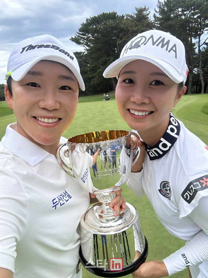 신지애(왼쪽)와 가나자와 시나가 우승트로피를 함께 들어 올리고 있다. (사진=KPS 제공) |