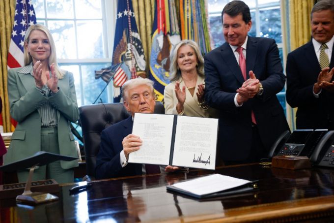 도널드 트럼프 미국 대통령이 15일(현지시간) 미 백악관 집무실에서 테네시주 멤피스에 대한 '안전 태크스포스(TF) 구성'을 지시하는 대통령 각서에 서명한 뒤 기념사진을 찍고 있다. 트럼프 대통령은 이날 멤피스에 주 방위군을 투입한다고 밝혔다.  /AFPBBNews=뉴스1