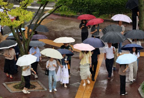 지난 15일 광주 북구 중흥동에서 시민들이 내리는 비에 우산을 쓰고 걷고 있다. /연합뉴스