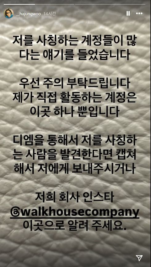 하정우는 자신의 SNS에 "저를 사칭하는 계정이 많다는 얘기를 들었다. 우선 주의를 부탁드린다. 제가 직접 활동하는 계정은 이곳 하나뿐"이라고 밝혔다.