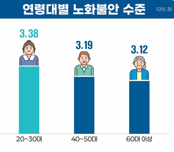 연령대별로는 20~30대 청년층의 불안 수준이 3.38점으로, 40~50대 중년층(3.19점)이나 60대 이상 고령층(3.12점)보다 높았다. 이에 대해 연구원은 미래에 대한 불확실성과 노후 준비에 대한 부담에 더해 노화 자체에 대한 부정적 인식이 청년층에서 상대적으로 더 크게 작용했기 때문이라고 분석했다.