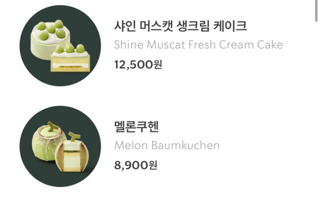 스타벅스 역시 지난 7월 '샤인머스캣 생크림 케이크'(1만2500원), '멜론쿠헨'(8900원)의 디저트를 선보였다.