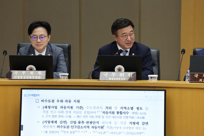 윤호중 행정안전부 장관(오른쪽)이 16일 세종시 정부세종청사 국무회의실에서 열린 42회 국무회의에서 발언을 하고 있다. <김호영 기자>