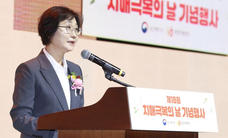 이스란 보건복지부 제1차관이 16일 서울 강남구 과학기술컨벤션센터에서 열린 ‘제18회 치매극복의 날 기념식’에서 기념사를 하고 있다.[보건복지부 제공] |
