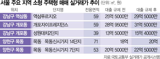 강남구 개포동에서도 전용 59㎡ 이하 소형 주택형의 인기가 높다. 개포동 B중개업소 대표는 “‘개포자이프레지던스’ 전용 59㎡가 이달 초 31억 5000만 원에 거래됐다”며 “직전 신고가보다 5000만 원 오른 가격”이라고 말했다. 이어 “급매물이 나오는 족족 소형 주택형은 매매가 이뤄지는 상황이고 중대형 매물은 가격이 높아서 매수세가 뜸하다”며 “중대형 주택을 살 사람은 이미 규제 전에 다 매수했다”고 덧붙였다. 개포자이프레지던스 전용 84㎡는 지난달 35억 5000만 원에 거래됐다. 하지만 이는 직전 월 거래보다 낮아진 가격이다.